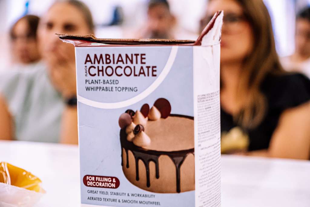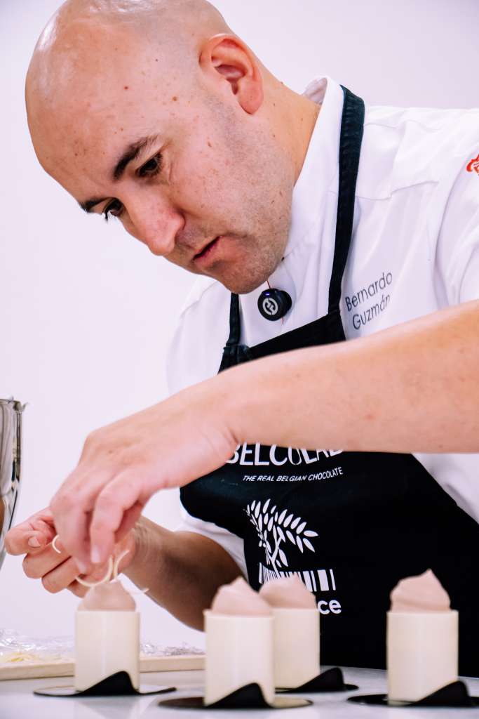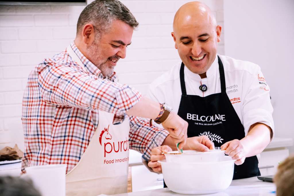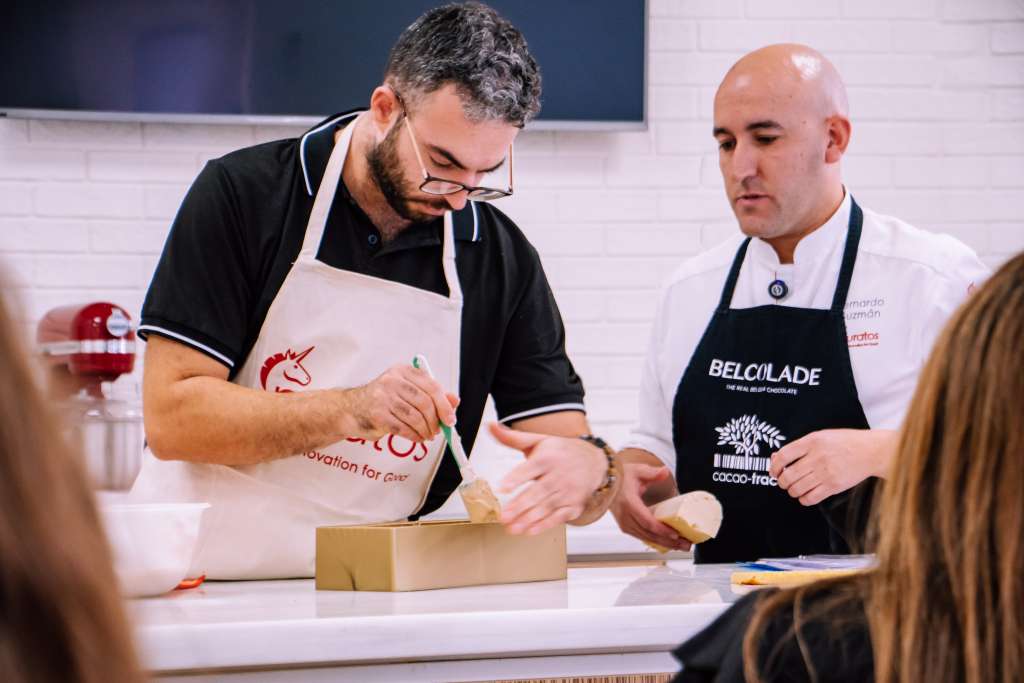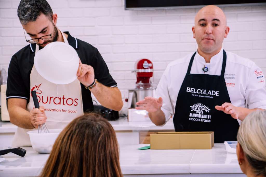 Una de las grandes lecciones del taller fue la importancia de seleccionar los ingredientes adecuados para obtener texturas, colores y sabores perfectos en cada elaboración. Bernardo aprovechó la ocasión para presentar algunos de los productos estrella de Puratos, como los diferentes tipos de chocolates y coberturas, además de Ambiante Chocolate, un ingrediente vegetal destacado en la repostería profesional por su estabilidad y firmeza.