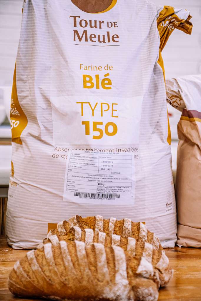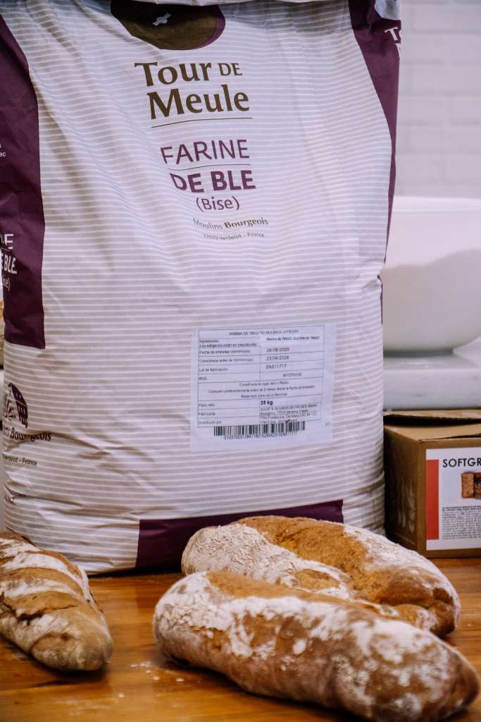 En la demostración, José Antonio trabajó con varios tipos de harina, destacando especialmente aquellas molidas a la piedra. Las harinas de piedra de Moulins Bourgeois son muy valoradas porque mantienen la integridad del grano, conservan nutrientes y aportan sabor y textura únicos. Durante el evento, se pudo ver cómo estas harinas dan panes con textura rústica, miga artesanal y carácter muy propio.