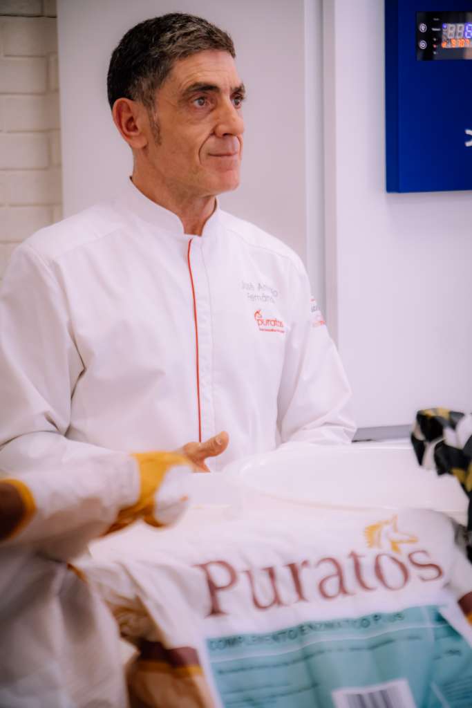Un ingrediente técnico protagonista en la demostración fue el Complemento Enzimático Plus de Puratos. Este aditivo ayuda a mejorar varios aspectos de la masa: facilita la fermentación, optimiza la elasticidad, mejora la retención de gases y contribuye a una miga más aireada y regular. José Antonio lo incorporó en varias de sus masas para mostrar cómo, incluso con harinas integrales o de granos complejos, se pueden lograr panes ligeros, bien estructurados y de gran volumen.