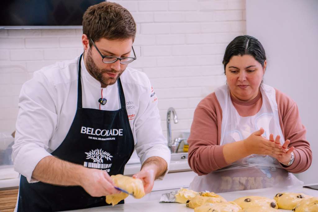 La jornada cerró con el rey de los dulces fermentados: el Panettone Pur Beurre, una elaboración que requiere paciencia, técnica y una materia prima de altísimo nivel. Bernardo mostró el uso del Pur Beurre de Puratos para obtener un panettone equilibrado, con un desarrollo excelente y una estructura elástica capaz de mantener las inclusiones sin hundirse. Se habló sobre la importancia del control de fermentaciones, del manejo de la masa madre y del tiempo de enfriado y oreo, aspectos esenciales para obtener un panettone profesional.