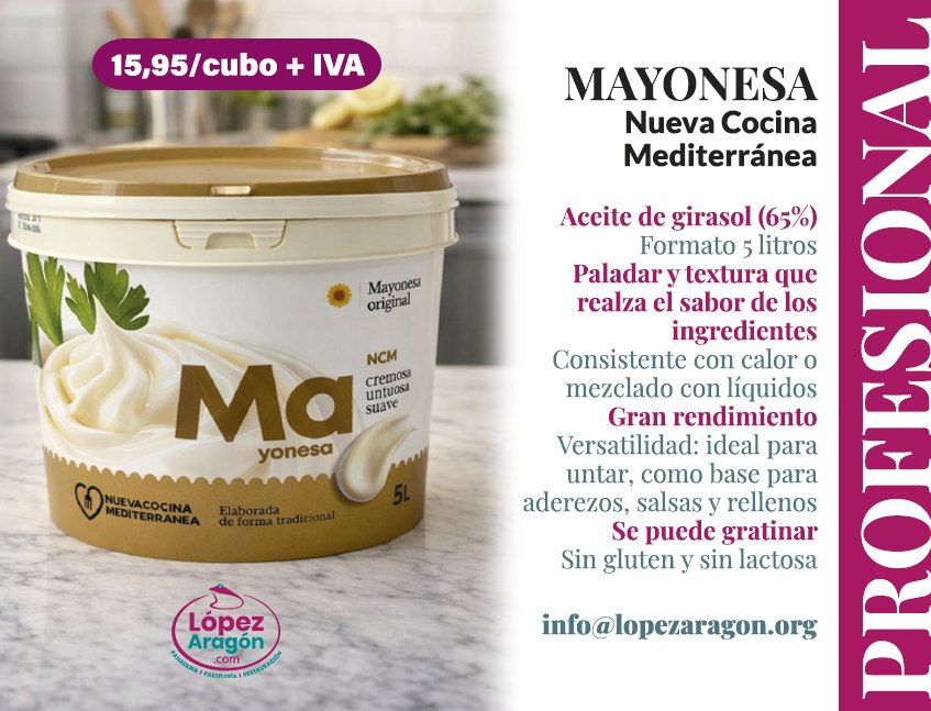 Si quieres incorporar la mayonesa de Nueva Cocina Mediterránea en tu cocina profesional, puedes comprarla directamente en López Aragón. Para pedidos y más información sobre precios, contacta con nosotros a través de info@lopezaragon.org o por teléfono. Una mayonesa de calidad profesional marca la diferencia en tu cocina.